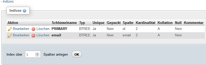 Mittels phpMyAdmin können Indizes über zwei Wege angelegt werden. Die erste Variante ist bei dem erstellen neuer Tabellen. Dort könnt in der Spalte Index den Typ des Index wählen.